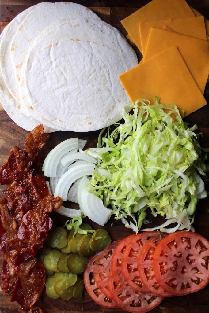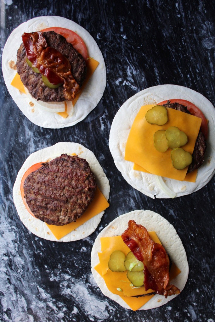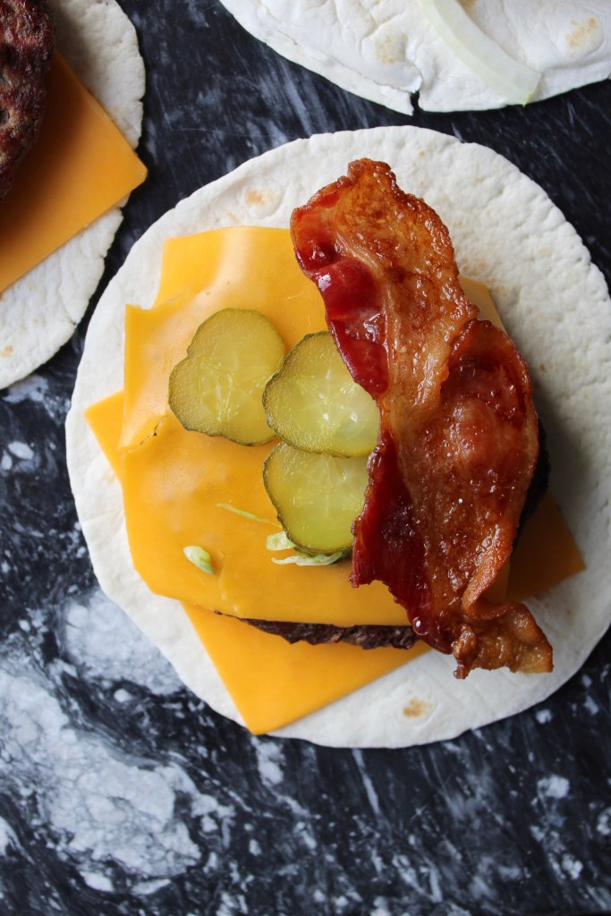 2. Lay down your first tortilla in the pan and layer on your slice of cheese, onion, tomato, burger, another slice of cheese, pickles, bacon and top with the other tortilla. Cook until lightly browned and cheese starts to melt then flip and cook on the other side.