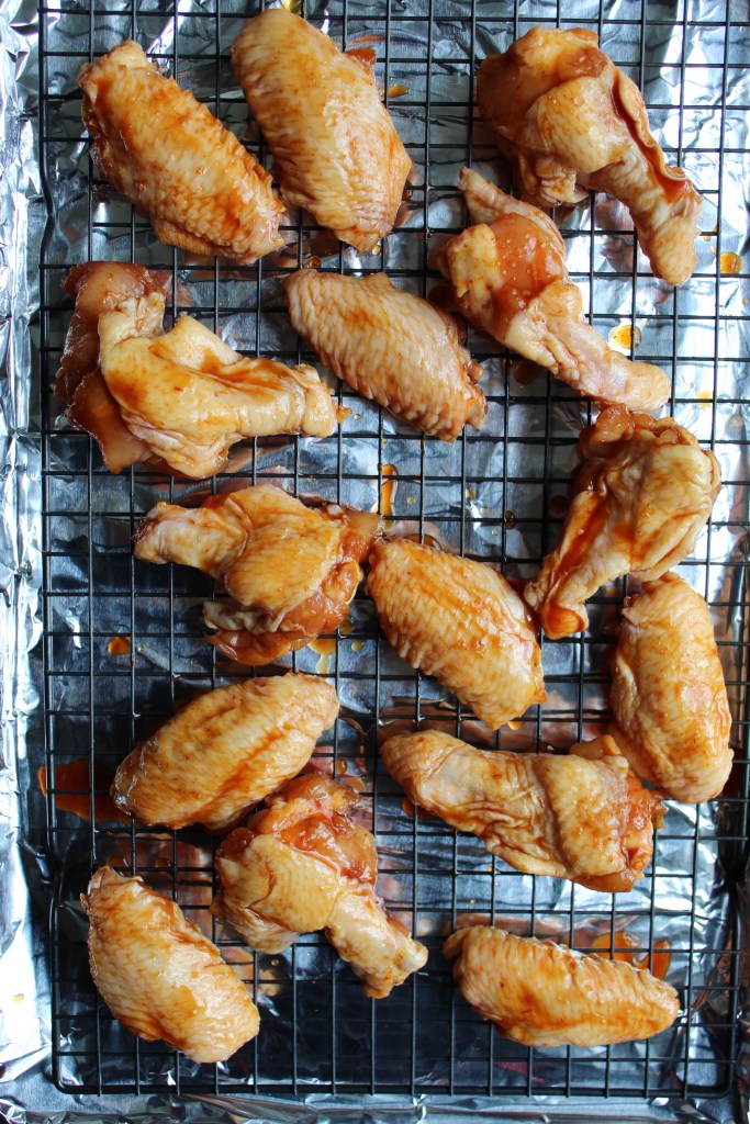 - Place wings on rack leaving space in between and bake for about 40-50 minutes until crispy and wings are done – reaching an internal temp of 165 degrees. Keep on eye on these wings though, all ovens are different. If they start to brown fast lower the heat, there is sugar in the sauce so the wings will get caramelized.