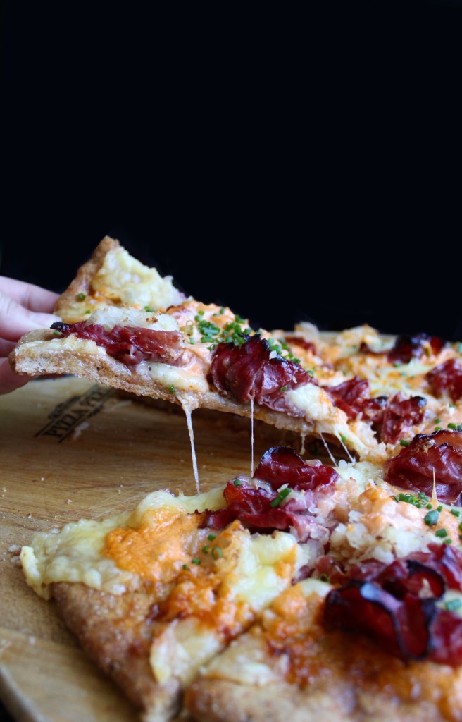 So the crust, I did a quick pizza dough but subbed in half of the flour with rye flour. It does make for a thicker crust FYI but the rye taste with the traditional reuben toppings were just magic. You can also stick to your normal pizza dough because the toppings are where all our flavor is. Do what works for you! Hear me out though…instead of corned beef I went with pastrami. I was born a corned beef girl, but something happened one holiday…last Christmas. My father and I were making corned beef Reuben’s for dinner together and he brought over some thin sliced pastrami too and it was ever since I changed my ways. I LOVE pastrami. If you like corned beef more, nothing changes. Both are perfect for this. Let’s get to it!