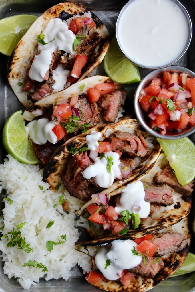 - Serve the steak tacos with additional pico & sour cream on the side, some extra rice and garnish with cilantro and lime!
