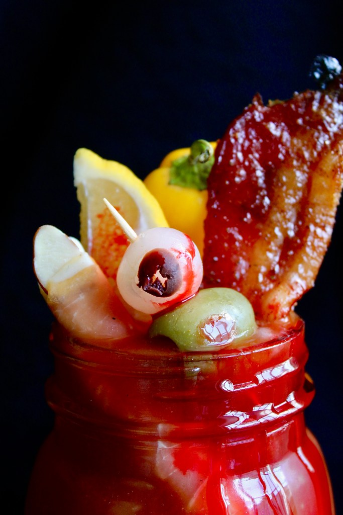 - Get your garnishes ready, I used a cocktail onion and thinly sliced kalamata to make an eyeball.