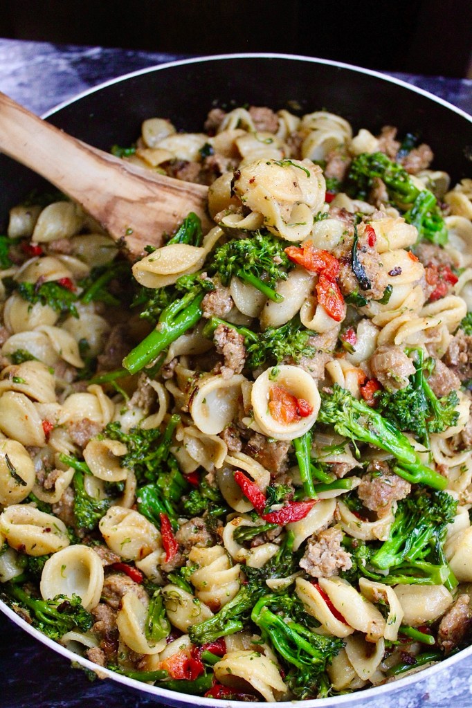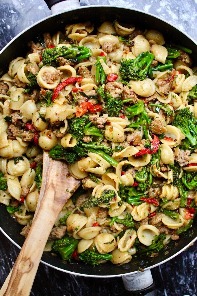 - Once sausage is cooked through, reduce heat to low, add in your chopped broccolini, stir and cover with a lid for 5-8 minutes.